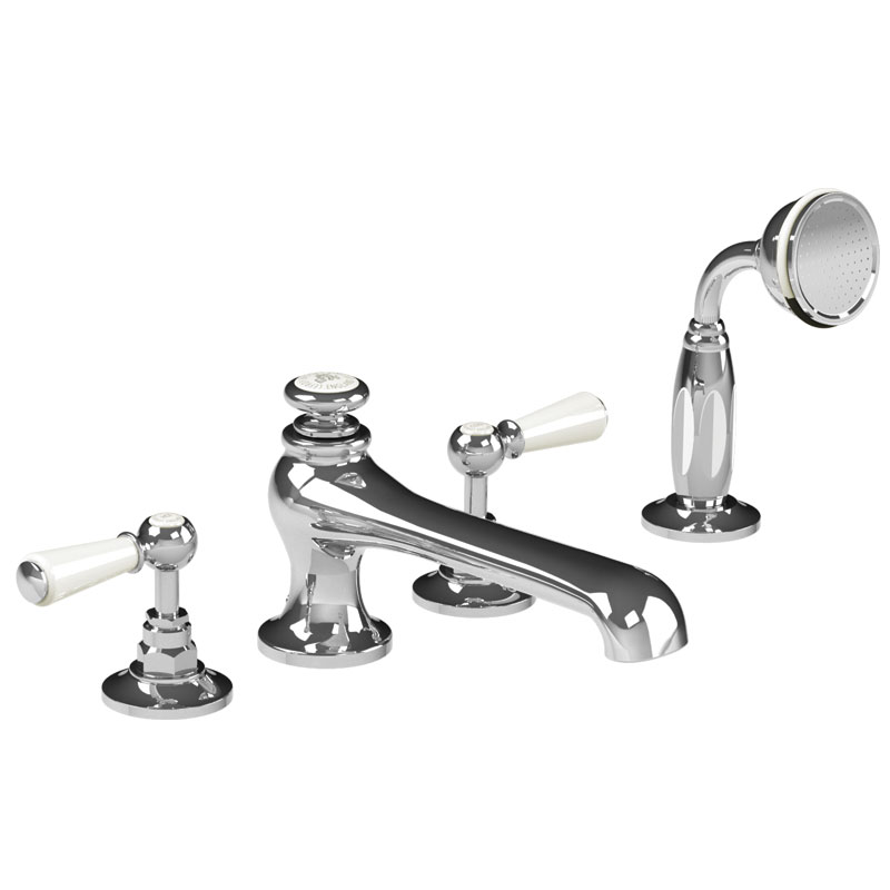White lever 4-hole bath set with diverter & pull-out metal finish hand shower trim only, to suit R1-4025 rough