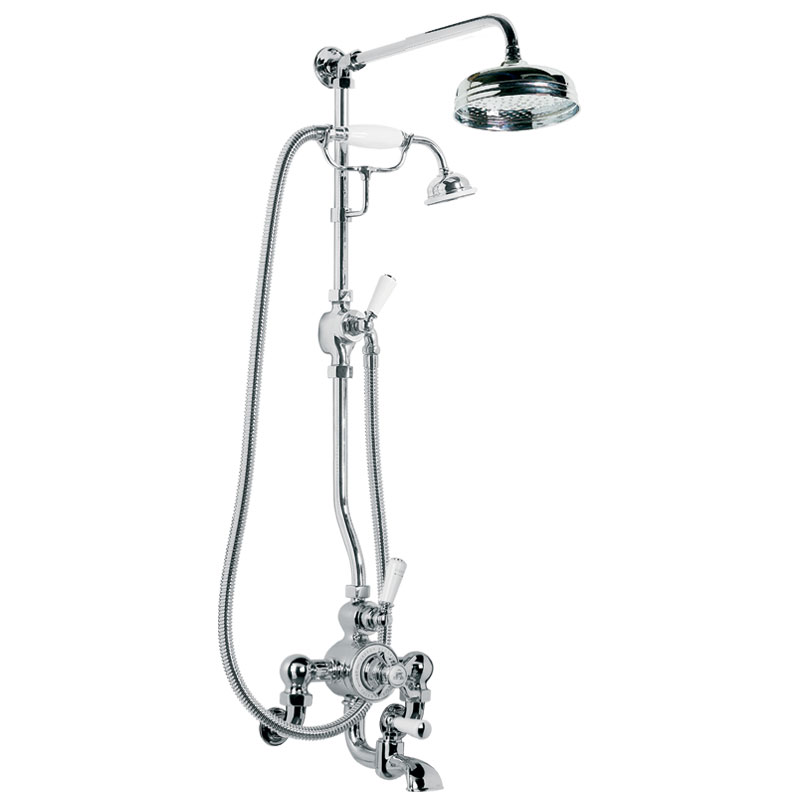 Exposed thermostatic bath and mixing valve, riser kit, handset, lever diverter, 8" rose and adjustable riser pipe bracket Wall mounted