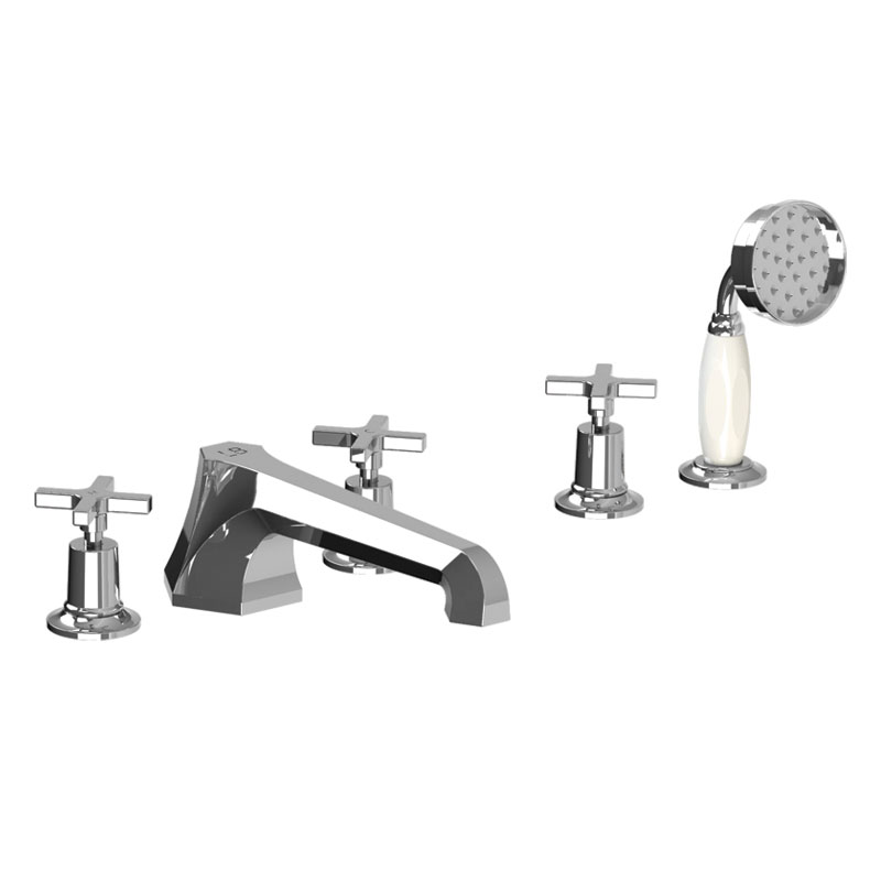 Cross handle 5-hole bath set & pull-out white hand shower with deck diverter trim only, to suit R1-4006 rough